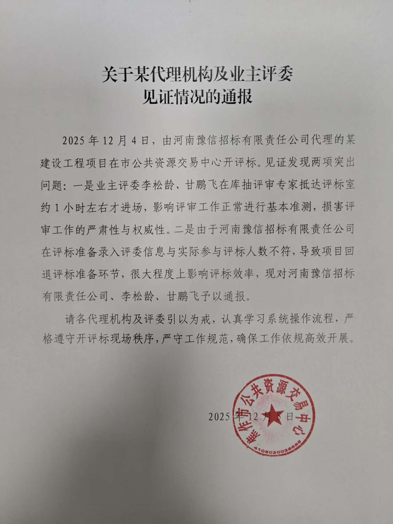 关于某代理机构及业主评委见证情况的通报
