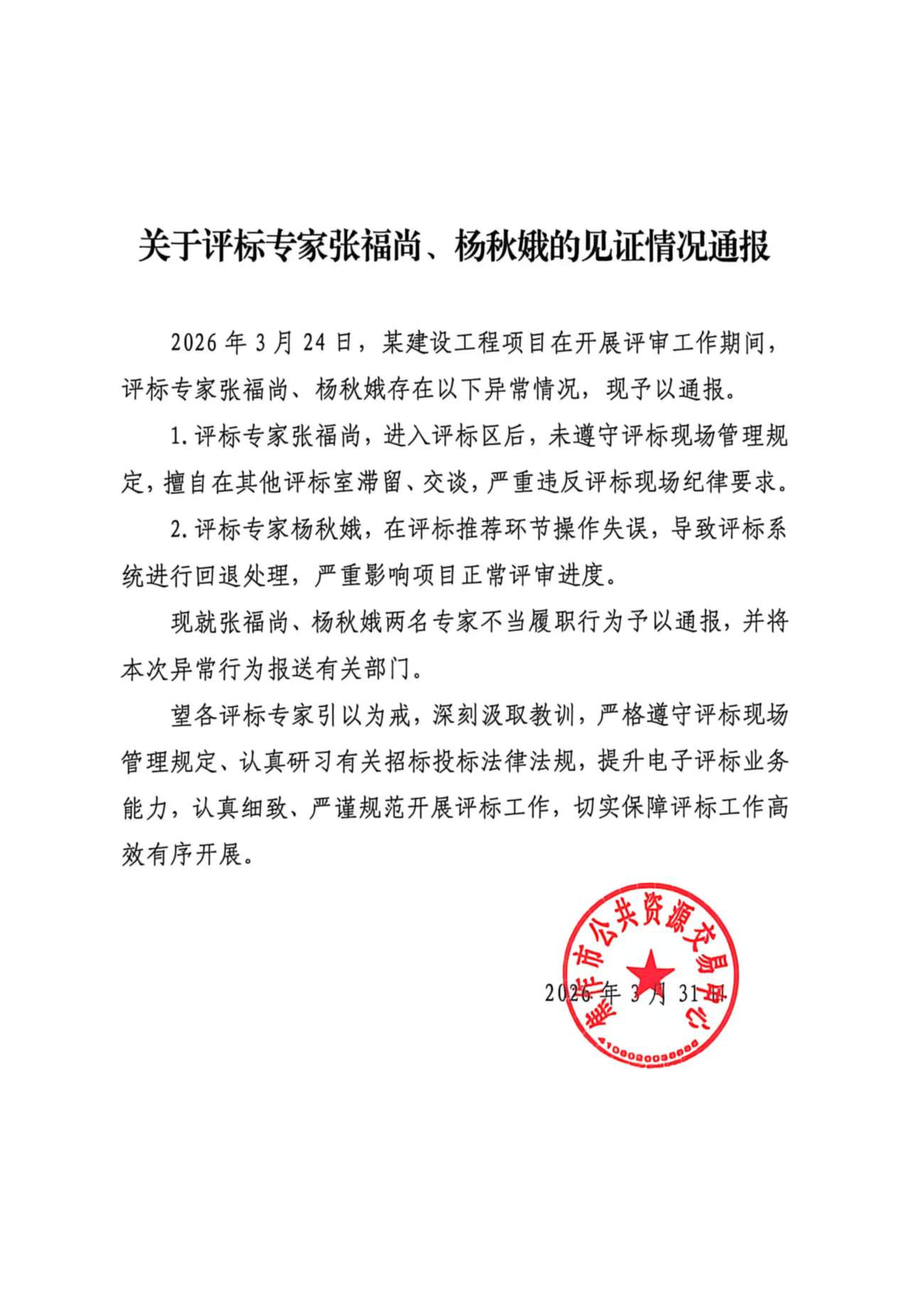 关于评标专家张福尚、杨秋娥的见证情况通报